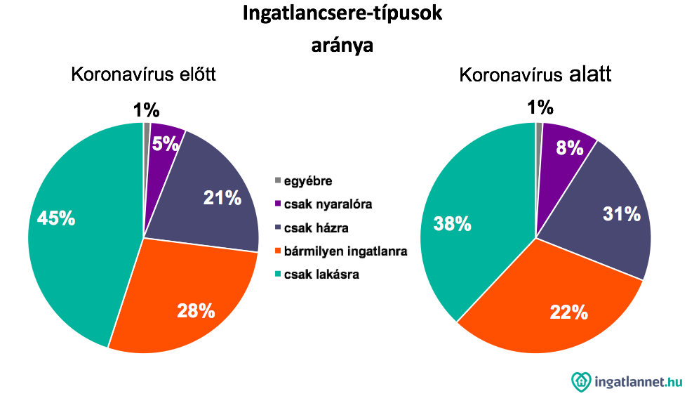 Az elemzésből kapott eredmények közül kitűnik, hogy a koronavírus miatt slágerré vált házak és nyaralók kifejezetten az ingatlancserélők célpontjai lettek. Természetesen a lakáscserére továbbra is vezet, de a járványidőszak előtt ez a kategória sokkal gyakrabban (45%-ban) fordult elő, mint az elmúlt másfél évben (38%-ban). Ezzel szemben a házra történő csere aránya átlagosan 1 százalékponttal, míg a nyaralóra történő csere aránya átlagosan 3 százalékponttal nőtt meg.