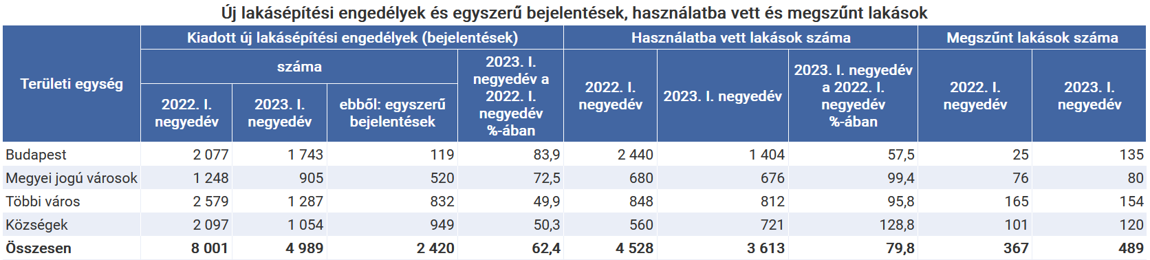 Az idei év első negyedévében 3613 új lakás épült, 20 százalékkal kevesebb, mint egy évvel korábban. A kiadott építési engedélyek és egyszerű bejelentések alapján építendő lakások száma 4989 volt, 38 százalékkal kevesebb, mint 2022 azonos időszakában – közölte a Központi Statisztikai Hivatal (KSH). (Ebből az egyszerű bejelentéssel épülő – azaz a 300 négyzetméter összes hasznos alapterületet meg nem haladó – lakóépületek száma 2420 volt.)
