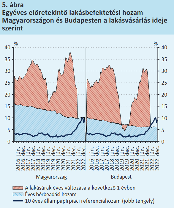 Míg 2016 elején országos átlagban még 16 százalék, Budapesten pedig 10 százalék bruttó hozamot is el lehetett érni egy év alatt, addig ez 2022 végére rendre 10 és 6 százalékra csökkent. A bérbeadási hozam csökkenését a lakásárakat elmúlt években jellemző dinamikus, éves alapon 10–25 százalékos emelkedése okozta, ami a befektetések teljes hozama tekintetében értéknövekedésként kompenzálta a befektetőket. Az elmúlt hét évben lakásbefektetéssel és bérbeadással a vásárlást követő egy évben országos átlagban jellemzően 26–38 százalékos, Budapesten pedig 23–33 százalékos bruttó hozamot lehetett elérni a bérbeadás és az értéknövekedés együttes figyelembevételével. Ez alól kivétel a 2019. első és 2020. utolsó negyedév közötti időszak volt, amikor a koronavírus-járvány kitörését követően ideiglenesen visszaesett a lakáskereslet és lassult az árnövekedés üteme.