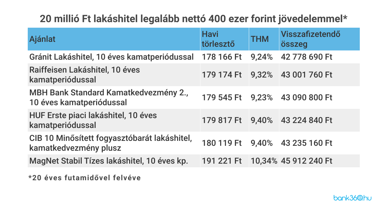 A visszafizetendő összeget tekintve a CIB fogyasztóbarát lakáshitele a legkedvezőbb: 9,40 százalékos THM mellett a havi törlesztő – az első tíz évben – 135 089 forint, a futamidő végén pedig 32 427 960 forintot kell visszafizetni a 15 milliós kölcsönért.