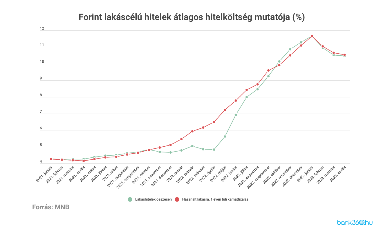 Az idei év első négy hónapjában 154 milliárd forintot tett ki az új szerződések értéke, amelynek nagy részét (110 milliárd forintot) használt lakás vásárlásához használták fel. A használt lakásra, éven túli kamatfixálással felvett kölcsönök átlagos hitelköltség mutatója a januári 11,66 százalékos csúcsról áprilisra 10,53 százalékra mérséklődött (az átlagos kamat 10,64 százalékról 9,68 százalékra csökkent) az MNB statisztikája szerint. A hitelkamatok egy év alatt megduplázódtak, így nem meglepő, hogy tavaly január-áprilisban még háromszor nagyobb összegre, 493 milliárd forintra rúgott az akkor megkötött lakáshitel-szerződések összértéke. Ebben a nagyon kedvezményes zöld hitelek iránti kereslet is jelentős szerepet játszott, hiszen éppen ezekben a hónapokban hajráztak érte az ügyfelek.