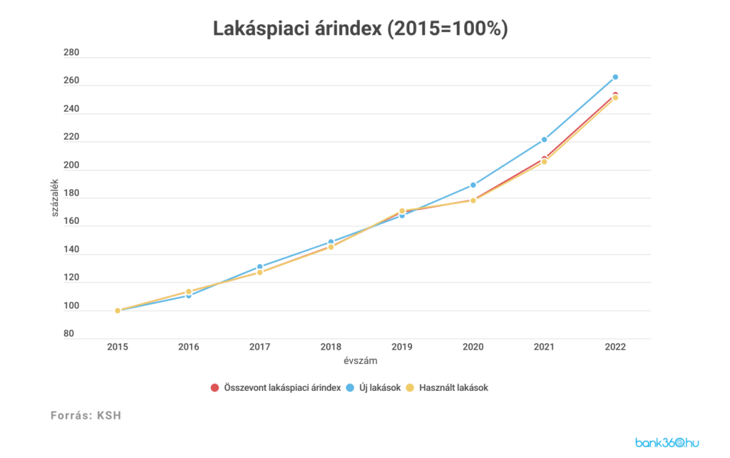 Tavaly az év végén már kis mértékben csökkentek a lakásárak (az utolsó negyedévben országosan 2,2 százalékkal az előző negyedévhez képest), de az egész évet tekintve rekord drágulás volt a magyar piacon, nominálisan 22 százalékos 2021-hez képest. Az elmúlt években jó befektetésnek bizonyult a lakás, az árak hét év alatt (2015 óta) két és félszeresükre (254 százalékkal) emelkedtek. (Az új lakásoknál 266 százalékos, a használt lakásoknál pedig 251 százalékos drágulást mért a KSH.) Tavaly a használt lakások ára több mint 22 százalékkal, az újaké 20 százalékkal volt magasabb, mint egy évvel korábban.