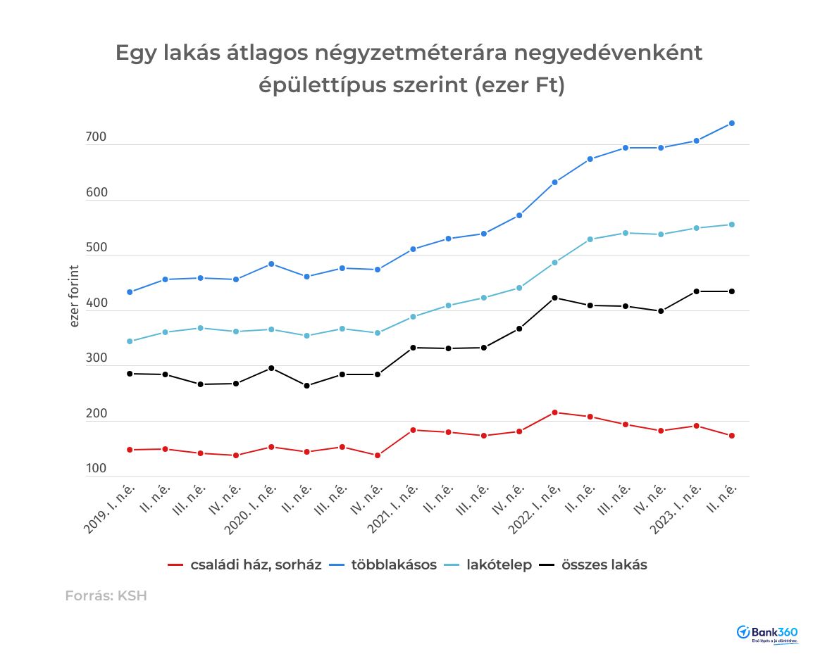 A családi házak leértékelődése azért is fájdalmas lehet a tulajdonosoknak, mert eközben a többlakásos és lakótelepi lakások ára emelkedett. Ezeknek kisebb lehet az energiafogyasztása és alacsonyabb a rezsije a családi házakhoz képest. A többlakásos házban lévő lakások átlagos négyzetméterára 2022 első negyedévéhez képest 17 százalékkal (738 ezer forint/négyzetméter), a paneleké 14 százalékkal nőtt (555 ezer forint/négyzetméter) 2023 második negyedévére. (Egy év alatt szerényebb, 9,5 százalékos, illetve 5 százalékos a drágulás.)