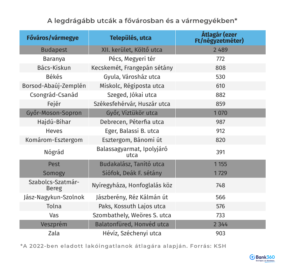 Többszörös az árkülönbség a budapesti és a vármegyei legdrágább utcák átlagárai között is. A fővárosban a XII. kerületi Költő utcában és Veszprém megyében, Balatonfüreden a Honvéd utcában adták el a legmagasabb fajlagos áron (2,3-2,5 millió forint) az ingatlanokat 2022-ben. Ehhez képest Nógrád megye legdrágább utcájában, a balassagyarmati Ipolyjáró utcában 391 ezer forintért. (A KSH azokról az utcákról közöl adatokat, ahol az adott évben legalább három ingatlanadásvétel történt.)