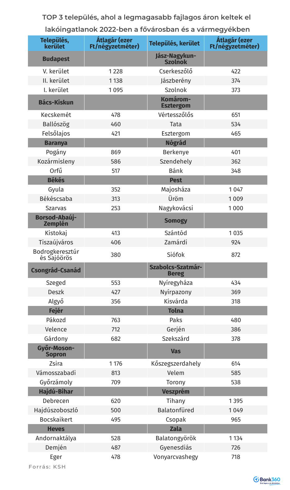 A 25 legdrágább magyarországi település közül 11-ben a négyzetméterár meghaladta az egymillió forintot, a 12. Nagykovácsiban kereken egymilliót regisztráltak, míg a 25. helyezettnél 860 ezer forintot. Két kakukktojásnak mondható település szerepel a képzeletbeli toplistán – Budapest több kerülete és agglomerációs települései, valamint balatoni frekventált települések mellett -, az osztrák-magyar határ menti Zsira és a Baranya vármegyei Pogány községek. Kevés és magas értékű tranzakciók történtek mindkét településen, Zsirán nyolc társasházi lakásé 1,176 millió forint/négyzetméter áron. Itt az új fejlesztések már 2020-ban és 2021-ben is egymillió forint körülire húzták az átlagárat, a Pécshez közeli, repülőteréről ismert Pogányban viszont 2022-ben öt családi ház értékesítésével ugrott – vármegyei rekordszintre – 869 ezer forintra az átlagos négyzetméterár. A megelőző két évről a KSH-nak nincs adóhivatali forrásból származó adata pogányi ingatlaneladásról, 2019-ben a fajlagos ár pedig jóval kisebb, 257 ezer forint volt. A pogányi 869 ezer forintos átlagár több mint duplája a Baranya vármegyei átlagnak, és mintegy 300 ezer forinttal magasabb a megyei második Kozármisleny és harmadik Orfű eladott ingatlanainak átlagánál.