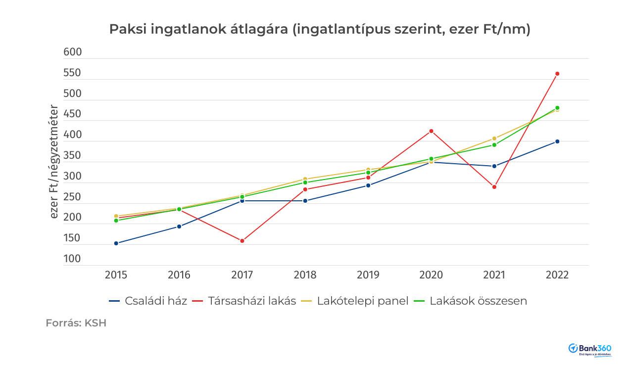 Paksnál a KSH a 480 ezer forintos átlagos négyzetméterár meghatározásához 158 lakóingatlan eladási árát vette figyelembe 2022-ben. A családi házak fajlagos ára 399 ezer, a társasházi lakásoké 563 ezer, a lakótelepi panellakásoké pedig 476 ezer forint volt. Az árak relatív szórása (az átlagtól való eltérést mutatja) 26 százalékos, ami pár százalékponttal magasabb, mint a megelőző években, de nem jelez jelentős árkülönbséget a paksi ingatlanállományban az ingatlan típusa és minősége alapján.