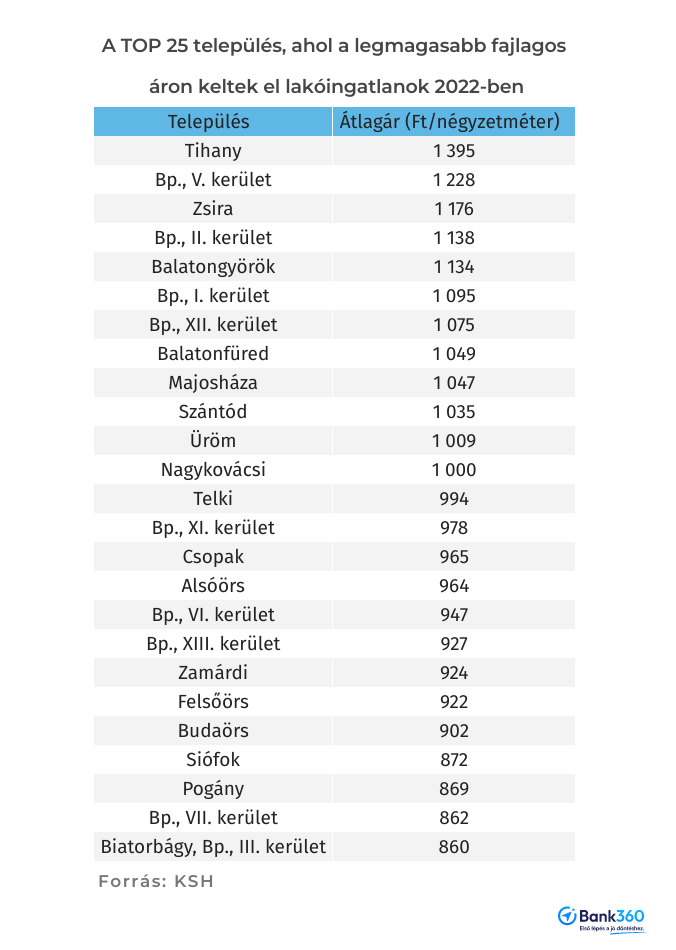 Budapesten az V., a II., az I. és a XII. kerületben haladta meg már 2022-ben az átlagos négyzetméterár az egymillió forintot, a főváros vonzáskörzetében, Pest megyében pedig Majosháza, Üröm és Nagykovácsi településeken adtak el milliós négyzetméterárakon lakóingatlanokat.