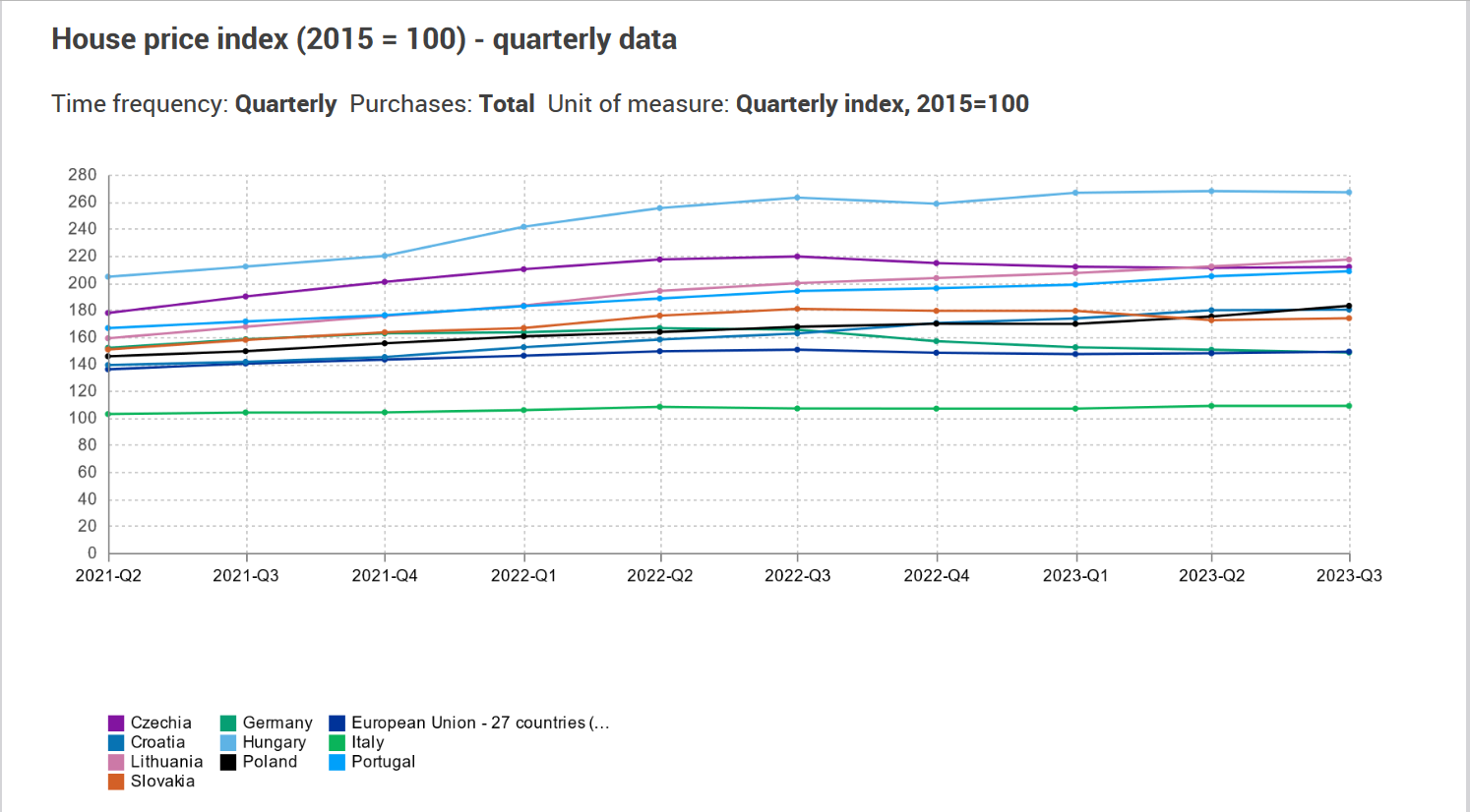 (Továbbá Izlandon, 230 százalékkal, az alacsony népességű szigetország az EU-nak nem, de az Európai Gazdasági Térségnek a tagja, és adatot szolgáltat az Eurostatnak. Görögország azonban egyelőre nem adott 2023-as lakásár-adatokat.)