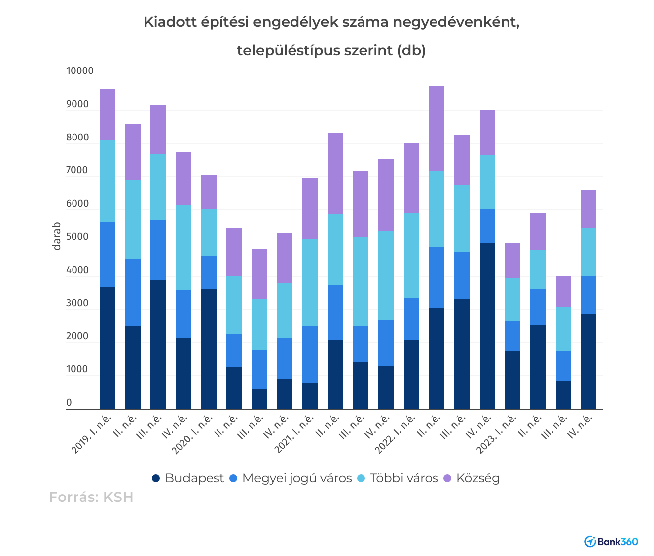 A kiadott építési engedélyek és egyszerű bejelentések alapján 21 501 lakás építését kezdeményezték, 39 százalékkal kevesebbet, mint 2022-ben. (Az első háromnegyed évben a használatba vett lakások száma még 21 százalékos, az engedélyeztetések pedig 43 százalékos elmaradásban voltak az előző év azonos időszakához képest.)