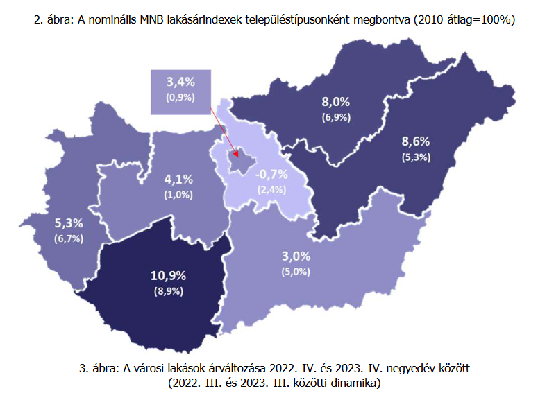 A lakásárak éves növekedési üteme minden településtípuson gyorsult, ami a főváros kivételével bázishatásnak volt köszönhető – írja az MNB. A fővárosban 2023 negyedik negyedévében 2 százalékkal nőttek a lakásárak az előző negyedévi 2,3 százalékos csökkenés után. A nominális éves lakásár-dinamika a fővárosban ezzel 3,4 százalékra gyorsult.