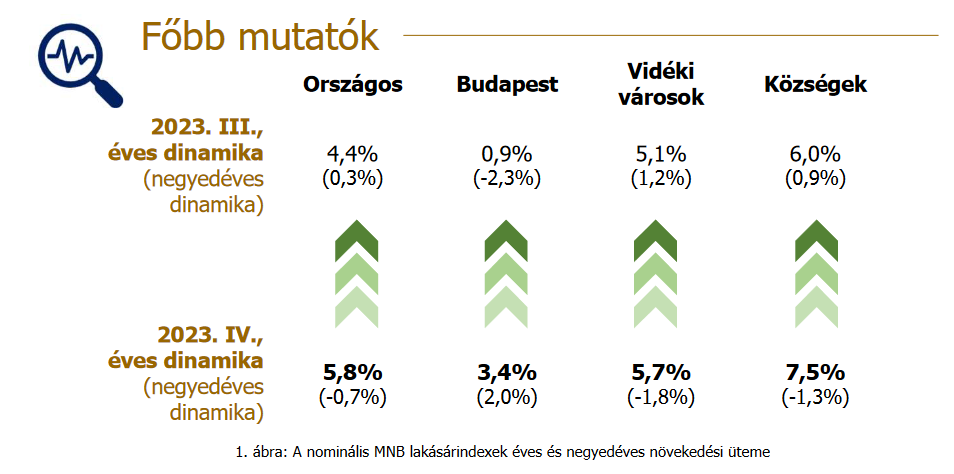 A Magyar Nemzeti Bank (MNB) lakásárindexe 2023 negyedik negyedévében 0,7 százalékos csökkenést jelez az előző negyedévi 0,3 százalékos emelkedést követően. Az éves növekedési ütem ugyanakkor az előző negyedévben megfigyelt 4,4 százalékról 5,8 százalékra gyorsult az alacsonyabb bázis miatt.