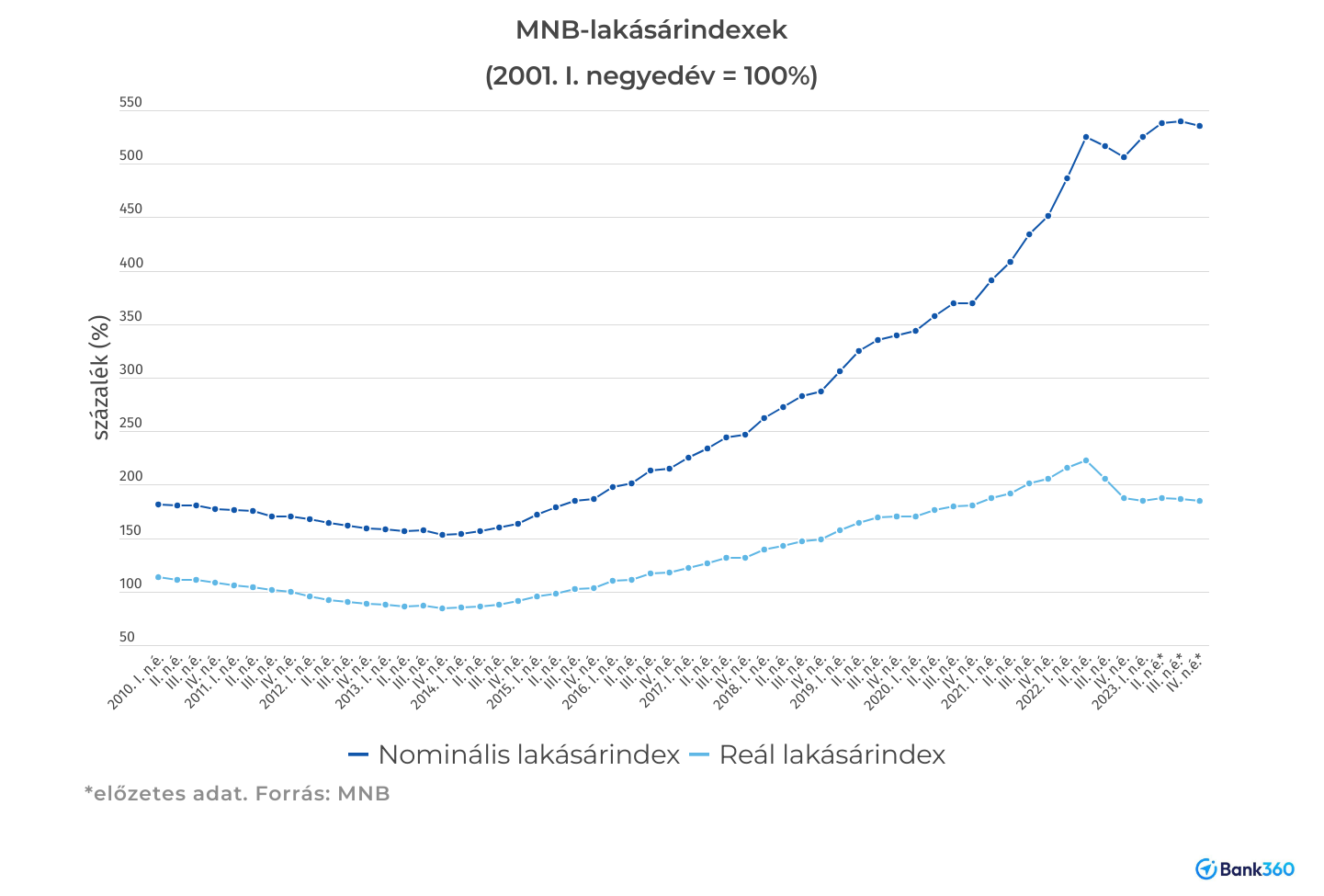 Az inflációt is figyelembe véve, reál értelemben viszont 1,8 százalékkal mérséklődtek éves szinten a lakásárak. (A magas infláció miatt az első negyedévben még 14 százalékkal, a második negyedévben pedig 16 százalékkal csökkent a lakások reálértéke éves szinten, majd a harmadik negyedévben 9,5 százalékkal, a negyedikben pedig 1,8 százalékkal.)