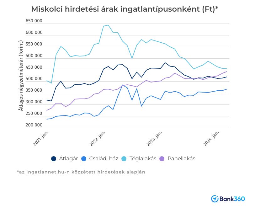 Az Ingatlanneten megjelent miskolci hirdetések irányáraiból látszik, hogy a rezsiszabályok módosításának bejelentésekor és hatálybalépésekor, 2022. július-augusztusban estek a lakásárak, majd a rezsi-védettebb téglalakások ára gyorsabban, a paneleké lassabban emelkedni kezdett. Az energiapazarlóbb családi házaké viszont csökkent. A miskolci hirdetések átlagos négyzetméterára 2024 elején 9 százalékkal kisebb volt, mint egy évvel korábban. A családi házak ára alig változott, a téglalakások eladói kénytelenek voltak árat csökkenteni, a paneleké viszont kis megtorpanás után ismét emelkedik. Január és március között már pár százalékos emelkedés látszik az összevont árindexben.