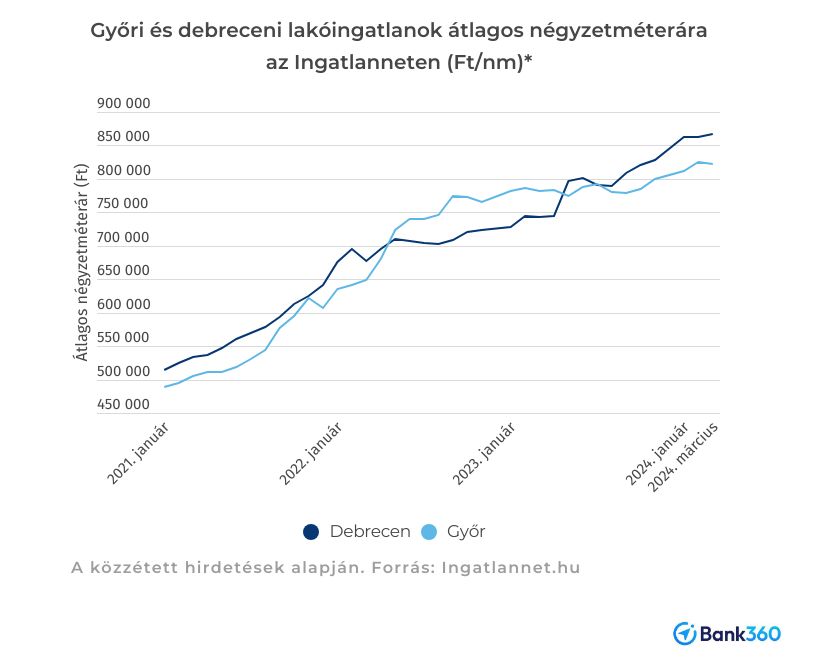 Az Ingatlannet.hu-n közzétett hirdetések négyzetméterárainak magasabb az átlaga, mint a KSH használt lakásokra vonatkozó statisztikájában (az előbbi kínálati ár és tartalmazhat új lakást is, míg az utóbbi szerződött, használt ár), de a változás itt is kirajzolódik: tavaly az év közepétől felfelé indultak a debreceni irányárak és beelőzték a győrieket. Az emelkedés 2024-ben is folytatódott. (A kereslet élénkülésével idén Győrben is felfelé mutat a hirdetési árak görbéje.)