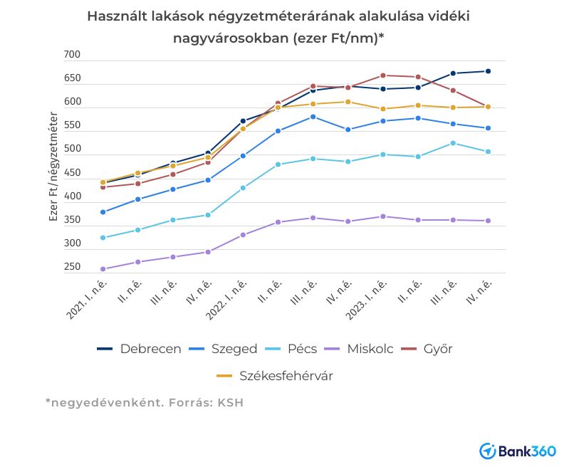 Több vidéki nagyvárosban is megtorpant a használt lakások árának növekedése az év végére. Kivéve Debrecent, ahol a folyamatos áremelkedés hatására az árak ismét meghaladják a korábbi legdrágább vidéki városét, Győrét. 2022 második negyedévétől, bő egy évig a nyugat-magyarországi megyeszékhelyen mérték a legmagasabb átlagos négyzetméterárat. (Ez előtt szintén Debrecen volt az éllovas, megelőzve Székesfehérvárt és Győrt.)
