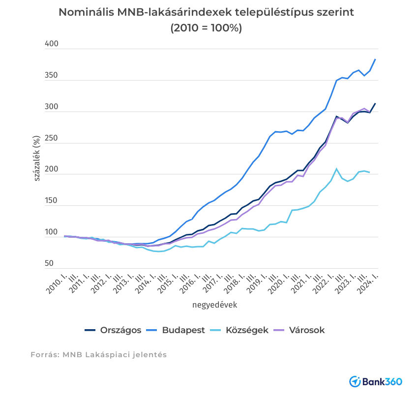 A lakásárak 2023-ban nagyrészt stagnáltak, a kereslet élénkülésével az év végére már 5,8 százalékos (infláció alatti) áremelkedést mértek éves szinten. Az inflációt is figyelembe véve ugyanakkor 1,8 százalékkal csökkenhetett a lakások reálértéke. Az idei első negyedévben a nominális áremelkedés üteme – az MNB lakáspiaci árindexe szerint – tovább gyorsulhatott 7,2 százalékra, Budapesten 6,1 százalékra.