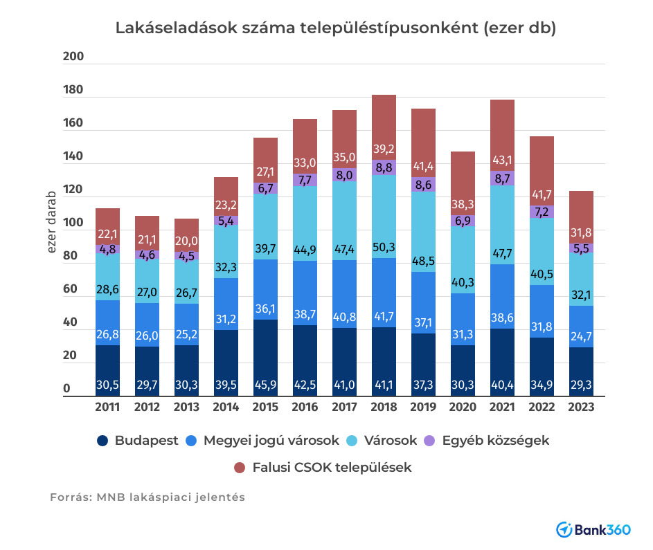 Magyarországon tavaly mintegy 123 ezer lakáseladás történt, ami 21 százalékkal kevesebb az előző évinél. A forgalom az utolsó negyedévben már élénkült, 2024 első negyedévében pedig országosan 30 százalékkal bővült az adásvételek száma az előző év azonos időszakához képest – állapította meg a Magyar Nemzeti Bank (MNB) májusi lakáspiaci jelentése. A tavalyi első negyedéves alacsony bázishoz képest a forgalom Budapesten 55 százalékkal, a megyei jogú városokban 41 százalékkal, a többi városban 21 százalékkal, a Falusi CSOK-ra jogosult településeken viszont csak 10 százalékkal nőtt 2024 első negyedévében.