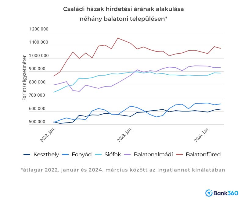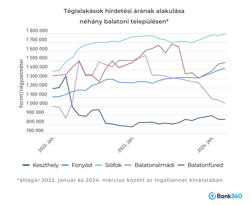 A balatoni agglomerációban a használt lakások ára tavaly az országos átlagot (5 százalék) jóval meghaladó mértékben (13 százalék) tudott emelkedni a KSH adatai szerint. A második negyedévben a négyzetméterenkénti átlagár 738 ezer forintra nőtt, ami az év végére 683 ezerre mérséklődött. Az új lakásoknál 1-2 milliós négyzetméterárakkal találkozhatunk, Siófokon például tavaly a fővárosihoz hasonló árakon keltek el az új ingatlanok (950 ezer – 1,3 millió forintért).