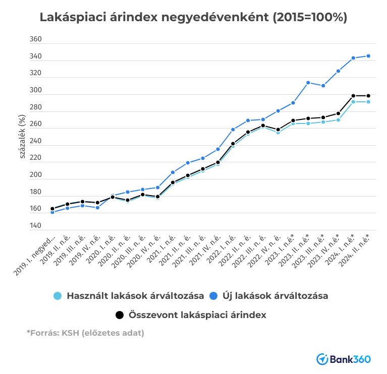 Az előző év azonos időszakához képest a használt lakások ára 9,6 százalékkal emelkedett, az új lakásoké pedig 10,1 százalékkal. Ez összességében egy év alatt 9,8 százalékos drágulást jelentett a lakáspiacon. Ezzel még tovább nőtt a különbség a használt és az új ingatlanok árai között, az előbbinél 2015 óta 190,8 százalékos volt az árváltozás, utóbbinál pedig már 245,4 százalék.