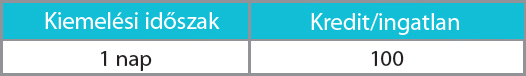 Az Első helyre kiemelés szolgáltatást az Aktív ingatlanhirdetések listán, a hirdetés mellett található Első helyre kiemelés gombra kattintva tudja beállítani. Naptárrendszerünknek köszönhetően előre beállíthatja, hogy mely napokra szeretné az adott ingatlant kiemelni. Az első helyre kiemelés a megrendelés pillanatától adott nap éjfélig tart, ezért javasoljuk az ingatlanokat a következő naptári naptól kiemelni. Az egy ingatlanra vonatkozó első helyre kiemelés kreditben kifejezett árát az alábbi táblázat tartalmazza.