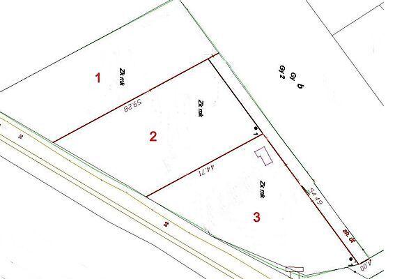 A telek jelenleg 2 helyrajzi számból áll. Készült egy megosztási vázrajz, amely szerint 3 db, magánúttal megközelíthető telek alakítható ki. minden telekre 1 lakóegység építhető.