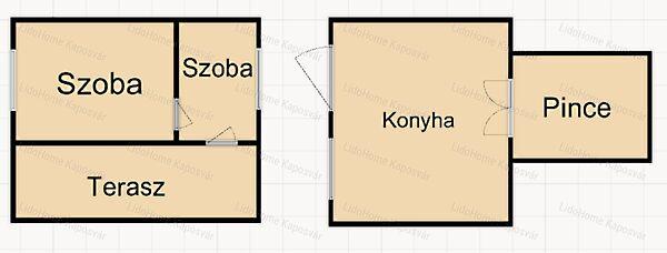 A kis ház 2 szobából és konyhából, tárolóból, teraszból áll.