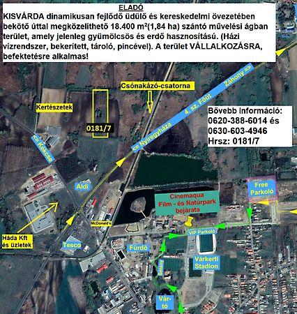 KISVÁRDA dinamikusan fejlődő üdülő és kereskedelmi övezetében bekötő úttal megközelíthető 18400 m2 /1.84 ha/ szántó művelési ágban lévő terület eladó. A bekerített területen házi vízrendszer, bekerített tároló és pince található. A terület Vállalkozásra, befektetésre alkalmas!