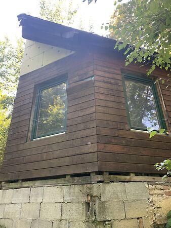 Közelében egy újonnan felállított 12nm-es, betonalapon álló, zöld színű szigetelt lemezgarázs áll, előtetővel. Ez az építmény jelenleg konyhának van kialakítva. Közvetlenül mellette egy 15nm-es OSB lapból épített szerszám és gyümölcstároló épült.