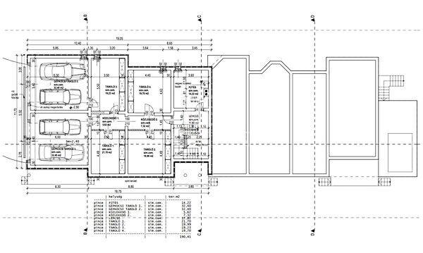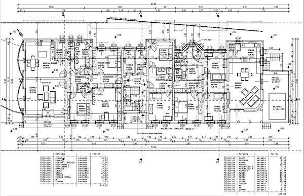 A lakások nettó lakóterülete 159 m2 és 174 m2, a pince szinten pedig mindkét lakás számára tároló helyiségek és garázsok lettek tervezve, melynek területe 190 m2.