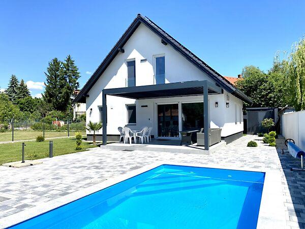A 752 m2 nagyságú területen 84.13 m2 lakóterű + 32.71 m2 terasz +18 m2 garázs kialakítású, új klímákkal felszerelt ingatlan kiváló választás nyaralásra, állandó lakhatásra.A részben alápincézett szinteltolásos ,félnyeregtetős ,gerincnél függőlegesen elcsúsztatott szigetelt épület pala héjazatot kapott.