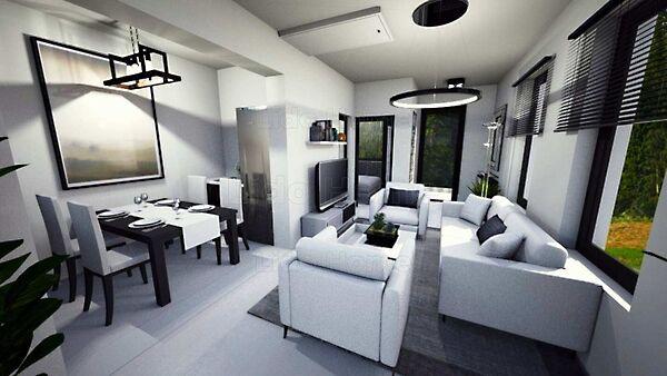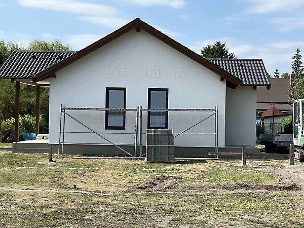 -Belső elosztása jól átgondolt és praktikus. A házban amerikai konyhás nappali, 2 hálószoba, fürdőszoba és egy előtér kapott helyet.