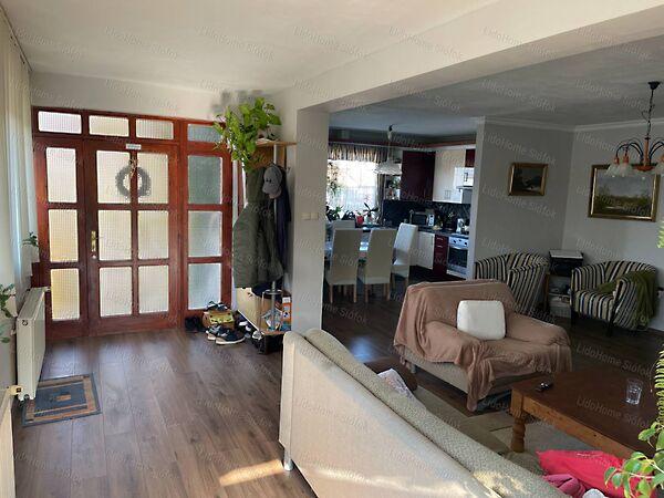 -A földszinten található Amerikai-konyhás nappali, 3 db hálószoba, kádas fürdőszoba külön wc-vel, közlekedő és egy lépcsőház, amelyen az alsó illetve felső szintet közelíthetjük meg és egy hatalmas fedett terasz.