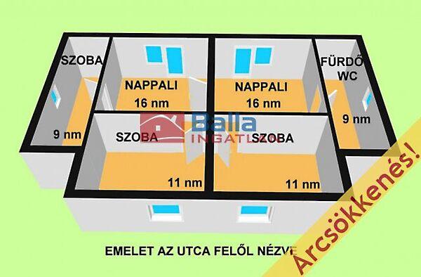 Az emeletes lakrész földszintjén egy zuhanyzós fürdőszoba, nappali, étkező, konyha, az emeleten két nagyobb közösségi tér és három szoba található a kádas fürdőszobával. Mindkét fürdőben van Wc is.