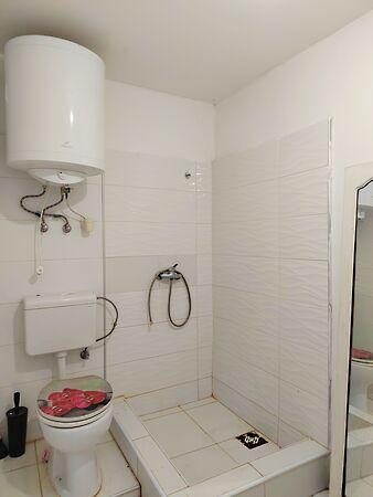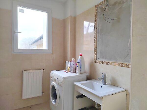 A főbejáraton, az előszobaból balra fekszik a zuhanyzós, WC-s furdőszoba, jobbra a nappali egyik bejárata nyílik, vele szemben a msáik fürdőszoba található, majd a hálószoba és egy előtér, ahonnan az udvarra, illetve a másik ingatlanhoz lehet kijutni. A nappali átlag feletti tágassággal rendelkezik, a maga 40 m2-ével. A másik, 40m2-es, kisebb ingatlan egy konyhából, étkezőből, egy szobából és egy fürdőszobából áll. A tető fagerendás, cseréptetős, némi javítást igényelne. A telken még további két tároló taláható, egy szintkülönbséggel lejjebb a Duna part felé lejtve, cca. 10 m szélességben. Itt parkolhat a gépjármű is.