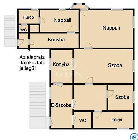 A kisebbik nappali, konyha, fürdőszobából áll, a nagyobbik pedig hatalmas nappaliból, két szobából, konyhából, fürdőszobából és wc-ből. Külön bejárat, külön lépcsősor, a két lakás teljesen elszeparált egymástól.