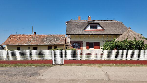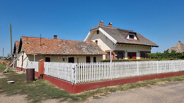 -A jó állapotú klimatizált, nádfedeles lakóépület földszintjén található: nappali+2 szoba, konyha, előszoba, fürdőszoba wc, lépcsőház. A tetőterében nappali+2 szoba, fürdőszoba, konyha helyiség található.