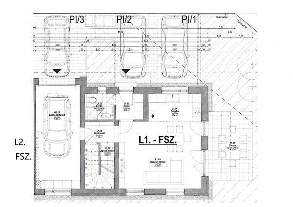 A nappali-étkező-konyhához kapcsolódik a terasz és a házat körülölelő zárt udvar, a 3 db gépkocsi parkoló az utcafronton kapcsolódik a közterülethez.