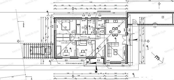 Győrújfalun, 2025 év végi átadással eladó egy 93,66 nm lakótér + 16,98 nm tároló alapterületű ikerház. (A rajzon a piros színnel jelölt ház)