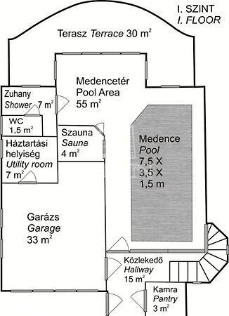 The lower ground floor includes an indoor swimming pool opening onto the garden, sauna, gym, shower room, separate WC, utility room, double garage, pantry and a terrace. The indoor swimming pool is heated and equipped with a current jet system and underwater lighting.