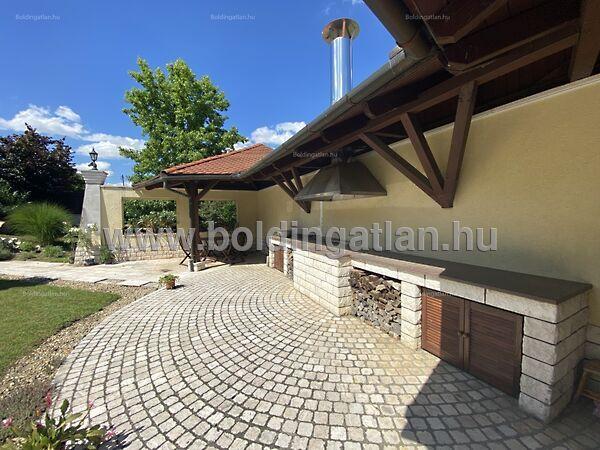 Kaposváron a Donner városrészben, kifejezetten csendes környezetben lévő, örök panorámás, igényesen megépített családi ház, gondozott udvarral, 2 autó részére kocsibeállóval, garázzsal eladó. A lakóház alsó szintjén (160 m2) tágas előszoba-közlekedő, fedett terasz, nappali, étkező, konyha, kamra, további 1 szoba, fürdőszoba-wc, illetve tároló helyiségek kerültek kialakításra. A tetőtérben (93 m2) gyönyörűen megmunkált látszó gerendás nappali panorámás terasszal, további 3 szoba, közlekedő, fürdőszoba-wc, és dolgozószoba helyiségek találhatóak A 160 m2-es szuteréneben party helyiségnek alkalmas nagy tér, nyári konyha, zuhanyzó-wc, téli kert, valamint és borospince vannak. Az épület fűtése és melegvíz ellátása gázközponti kazánnal és 2 db hőszivattyúval megoldott, az elektromos energia ellátását 10 kWh-os napelemrendszer biztosítja, továbbá a földszinti és az emeleti nappaliban légkondícionáló van felszerelve. Az igényesen parkosított udvarban számos növény, valamint grillterasz, napozó és medence vannak, valamint 2 db automata kapu és garázsajtó, illetve riasztó került felszerelésre. Telek: 1.630 m2