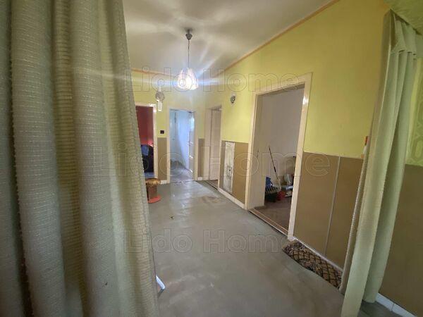 Helyiségek: előtér, közlekedő, főzőfülke, három szoba, fürdőszoba, spájz.