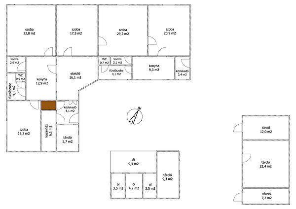 Az ingatlan két helyrajzi számon helyezkedik el, egy összesen több mint 1100 m²-nyi területen. A ház két lakrészre osztható: az egyik egy 70 m²-es, két szobás, míg a másik 110 m²-es, három tágas szobás otthont kínál. Minden lakrészhez saját fürdőszoba és mellékhelyiség tartozik, így a privát tér maximálisan biztosított akár összeköltözők számára is.