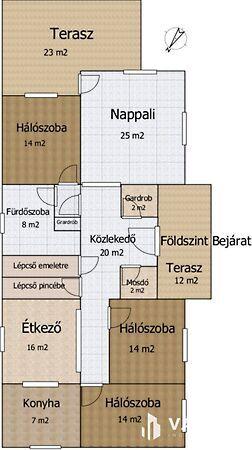 • Földszint: Fedett terasz, előtér, gardrób, vendég mosdó, nagy nappali teraszkapcsolattal, hálószoba, fürdőszoba, két szoba, konyha-étkező.