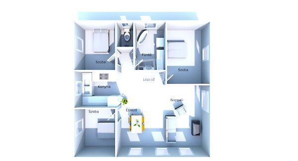 előtér/folyosó, 3 szoba, konyha, étkező, fürdőszoba, gardrób, kazánház.