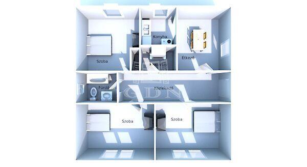 amerikai konyha, étkező+nappali, 3 szoba, fürdőszoba, külön helyiségben wc, erkély.