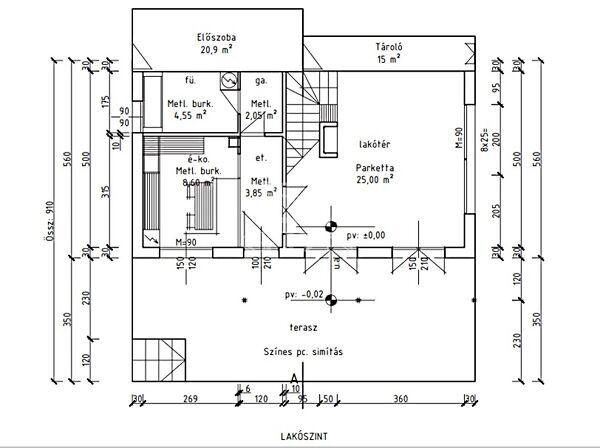 Szintek: pince szint: 23 nm, lakás szint: 45 nm+28 nm előtér, tetőtér: 38 nm.