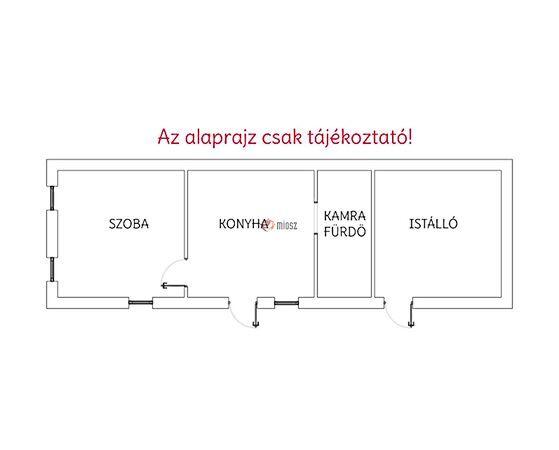 Az ingatlan az alábbi helyiségekből áll: konyha, szoba, kamra-melyből fürdőszoba kialakítható. Tartozik még az ingatlanhoz egy istálló, amivel átalakítást követően a lakótér tovább bővíthető.
