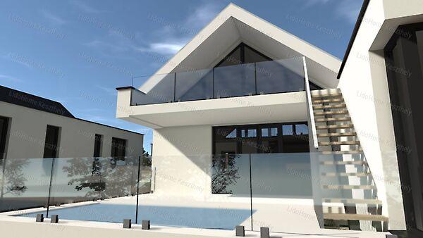 A családi ház teraszáról gyönyörű rálátás van a tájra. Medence és jacuzzi elhelyezésének lehetősége is biztosítva van. Terasz fűtése is kivitelezésre kerül, így a hűvösebb időben is lehetőség van a grillezésre.