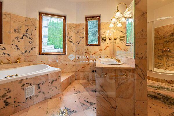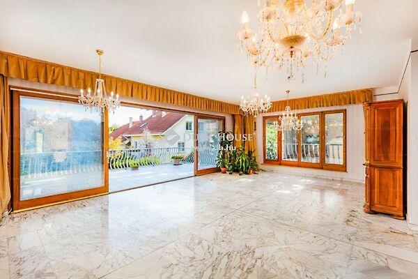 Befektetők ingatlanfejlesztők figyelem Ritka befektetési lehetőség Széchenyi hegy lejtőjén panorámás telken álló családi ház akár három lakássá történő átalakítási lehetőséggel eladó Az átalakításra már tervek készültek de a négy szinten található elegáns belső terek akár többféle elosztási leválasztási lehetőséget is magukban rejtenek A kilencvenes évek elején igényes anyagok felhasználásával saját célra épült házat átgondolt belső terek jellemzik A közel 450 m2 lakóteret minden szinten teraszok veszik körbe melyekre szinte az összes lakószobából kiléphetünk Műszaki jellemzők: Monolit födémek 30 as Porotherm falazat 10 cm dryvit szigetelés; háromrétegű üvegezéssel ellátott vörösfenyő nyílászárók; a hőellátást Vaillant gázkazán biztosítja radiátoros és padlófűtéssel; igényes márvány és gránit burkolatok Az ingatlanhoz három autó elhelyezésére is alkalmas 50 nm es elektromos kapun és fűtött lehajtón megközelíthető garázs is tartozik Elegáns akár többgenerációs családi ház vagy többlakásos társasház alakítható ki de optimális helyszíne lehet magánklinikának vagy cégközpontnak is