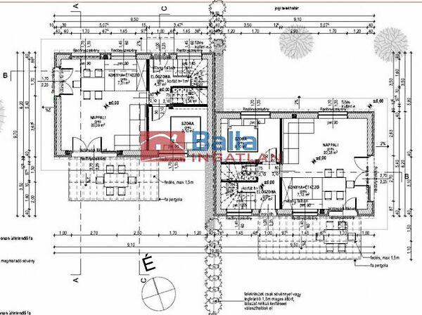 Pergolával fedett hátsó terasz, közvetlen kijárattal a nappaliból
